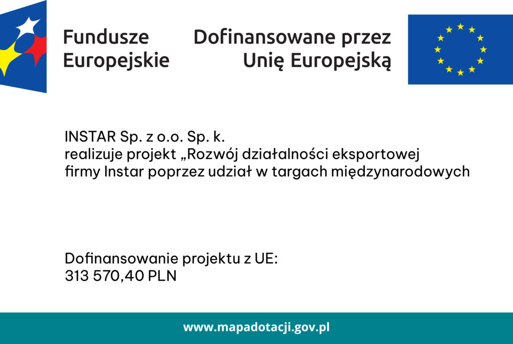 Firma INSTAR SPÓŁKA Z OGRANICZONĄ ODPOWIEDZIALNOŚCIĄ SPÓŁKA KOMANDYTOWA uzyskała dotację z Unii Europejskiej, w ramach Programu Fundusze Europejskie dla Nowoczesnej Gospodarki, Działanie Promocja marki innowacyjnych MŚP, na projekt „Rozwój działalności eksportowej firmy Instar poprzez udział w targach międzynarodowych.”