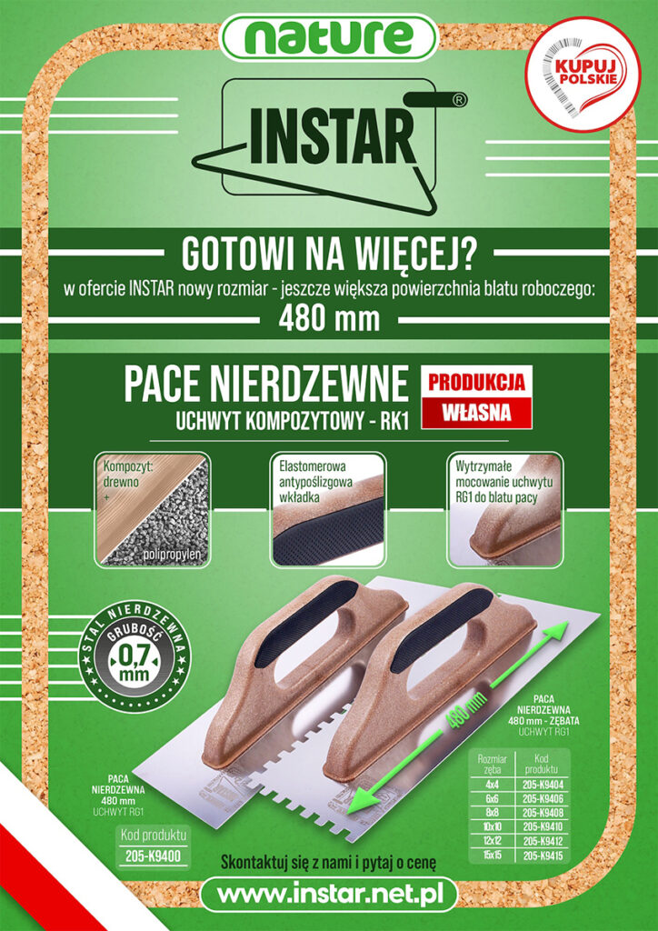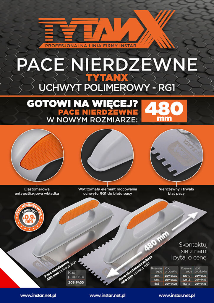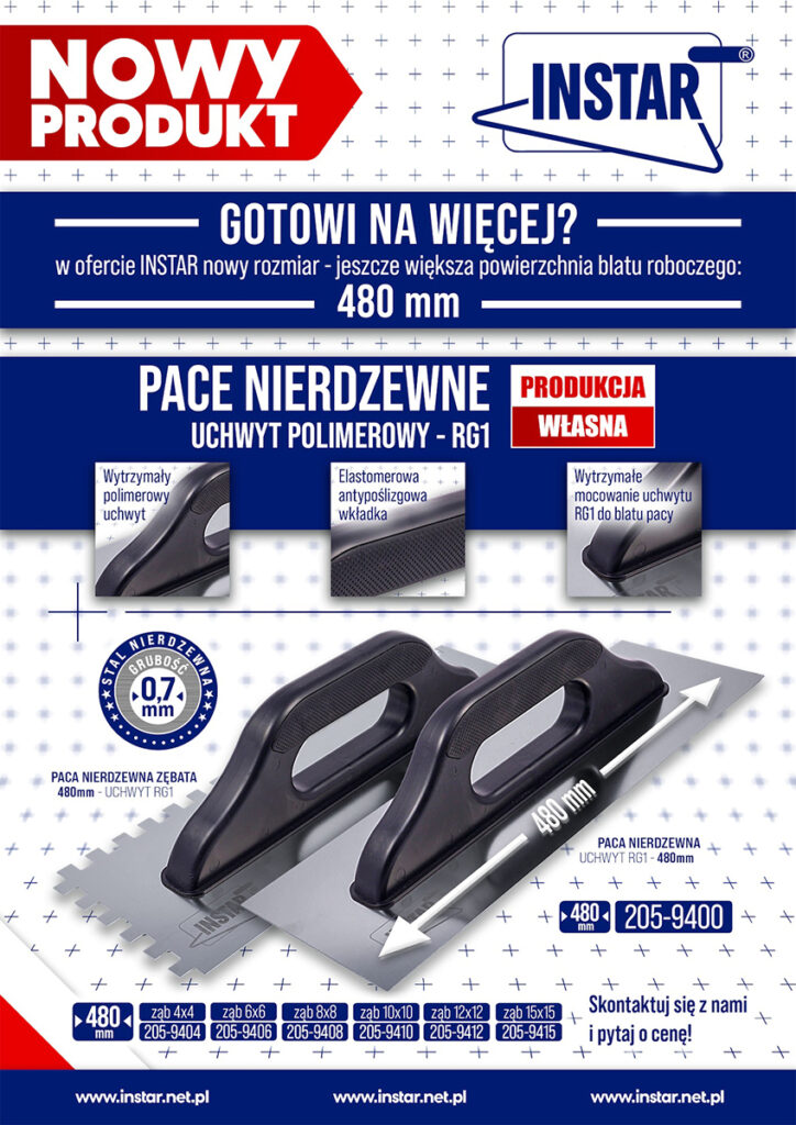 Kilka tygodni temu prezentowaliśmy nowość w naszej ofercie – pace nierdzewne z nowymi uchwytami. Byliśmy bardzo ciekawi, jak zostaną przyjęte, w końcu przyzwyczajenie do sprawdzonych narzędzi to rzecz naturalna. Wystarczyło jednak kilka tygodni od premiery, by nowe modele podbiły serca użytkowników. Opinie na ich temat są bardzo pozytywne, a dla wielu naszych klientów nowe pace stały się nie tylko alternatywą, ale i pierwszym wyborem. Ten doskonały odzew skłonił nas do podjęcia następnego wyzwania i przygotowania kolejnych pac z nowymi uchwytami. Tak powstały nowe modele z linii Instar, TytanX i Nature o długości 480 mm! Wyposażone w nowe uchwyty, wykonane z najwyższą precyzją i dokładnością, będą doskonałym wparciem każdej pracy.