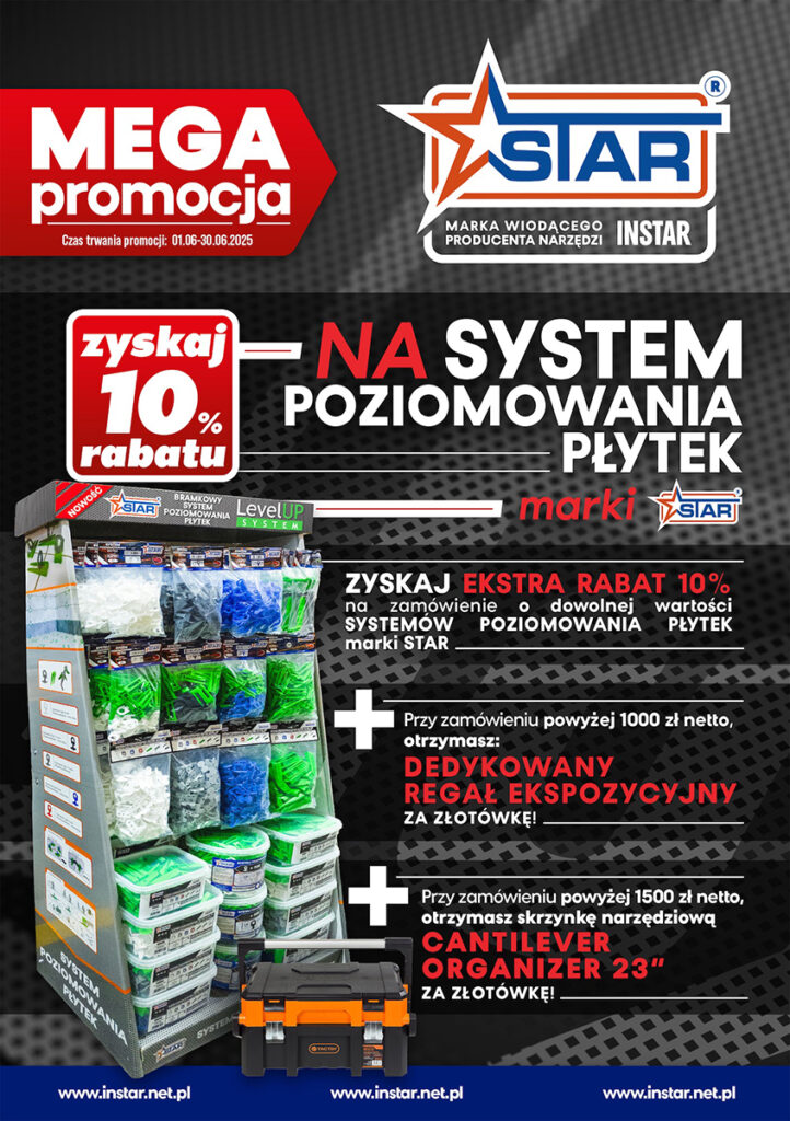 Nasza czerwcowa oferta promocyjna obejmuje dwa systemy poziomowania płytek, cieszące się nie tylko dużym zainteresowaniem, ale także świetnymi opiniami klientów. Oferta promocyjna obowiązuje w dniach 01.06.2025 – 30.06.2025 i dedykowana jest dla hurtowników i składów budowlanych.